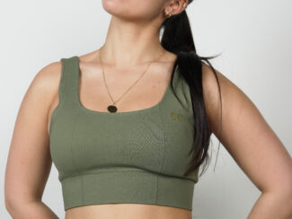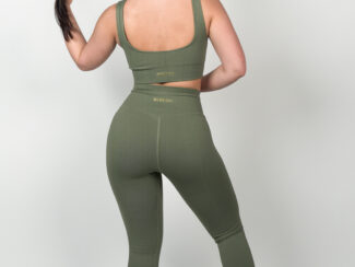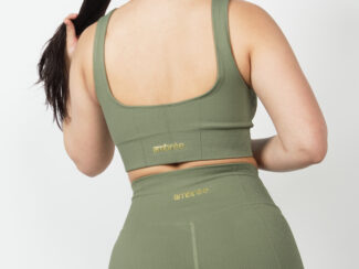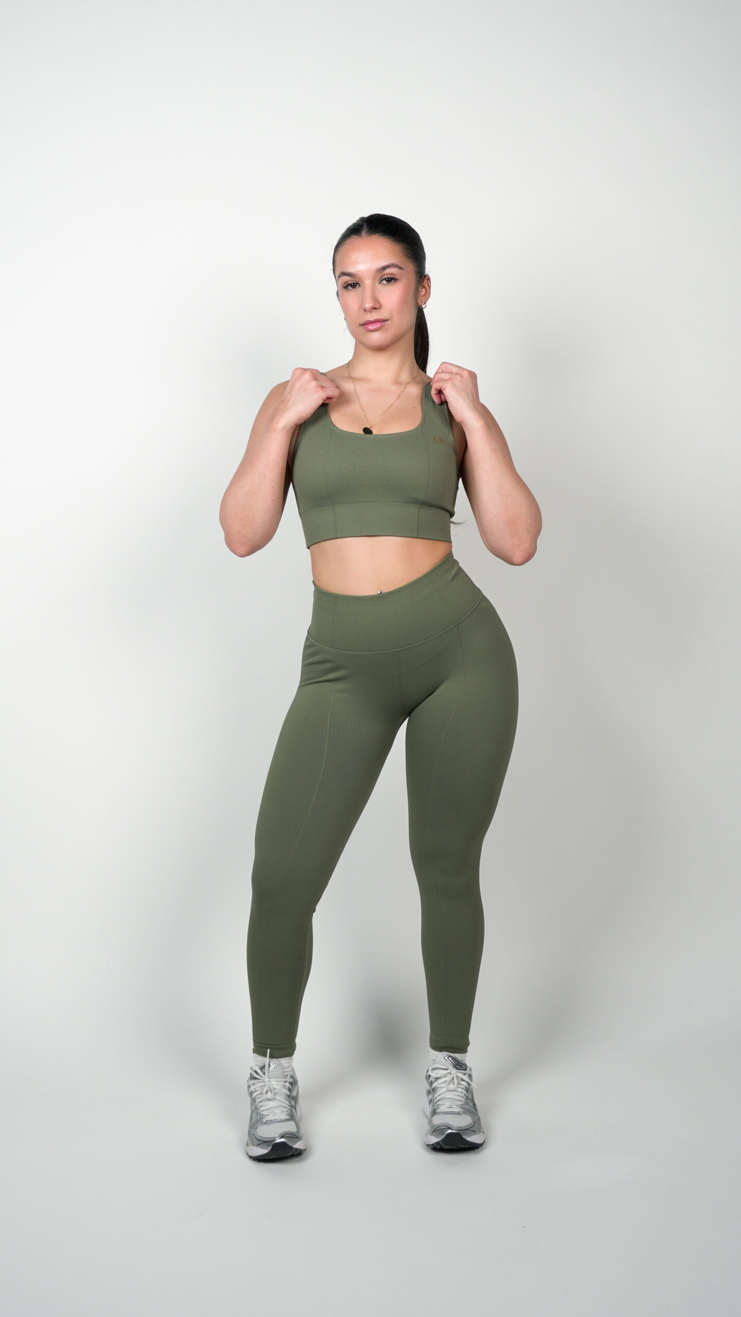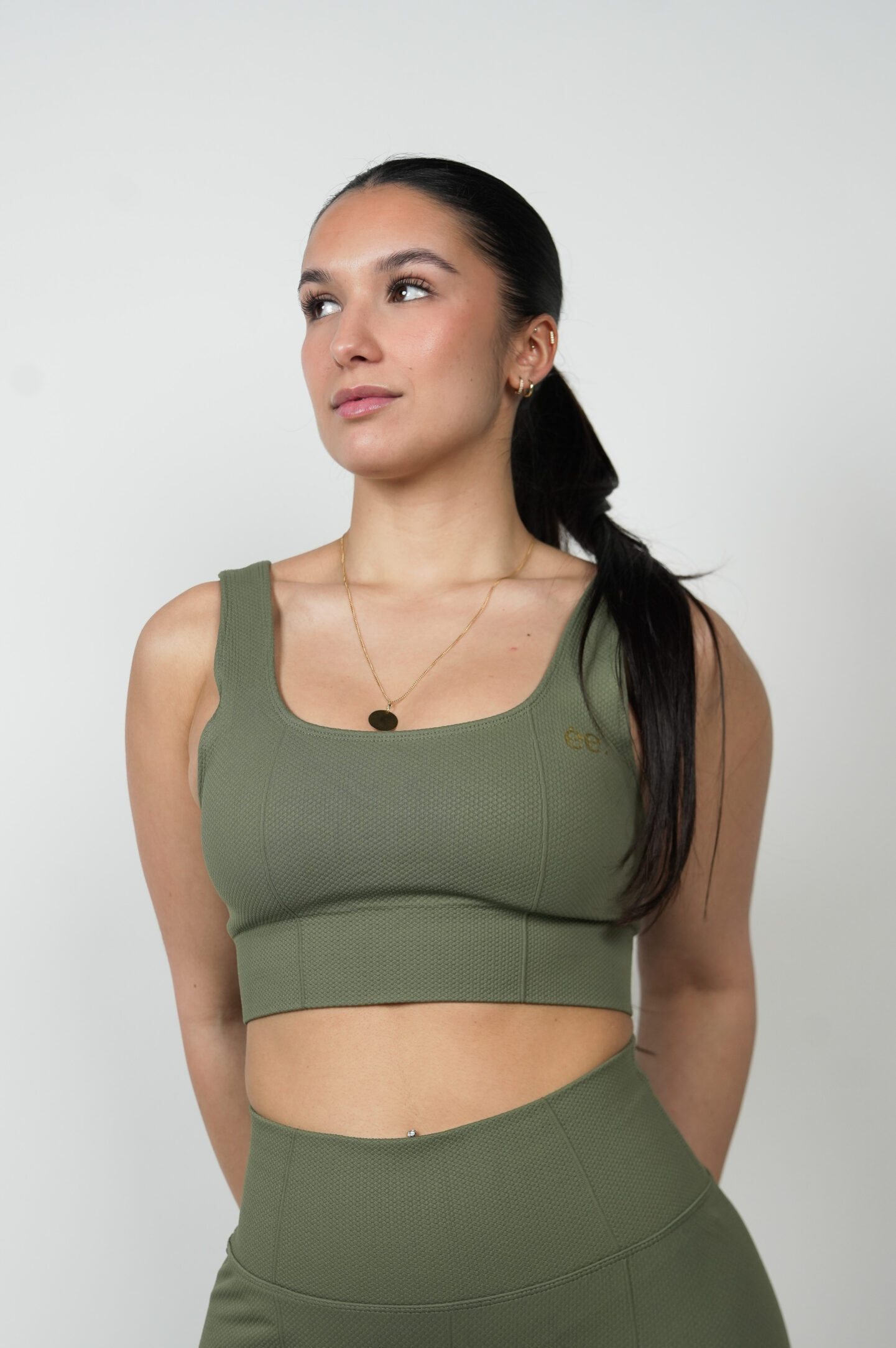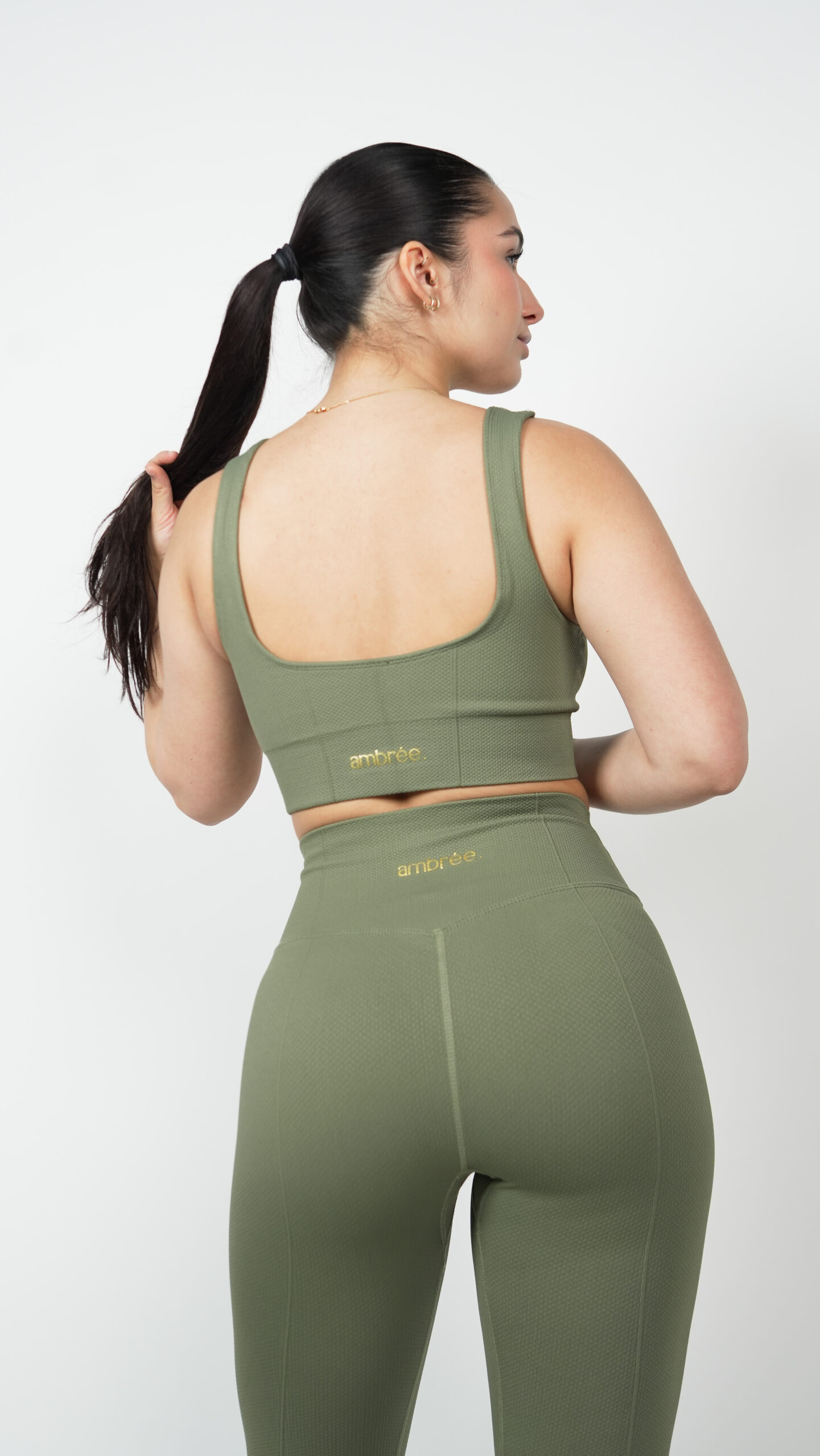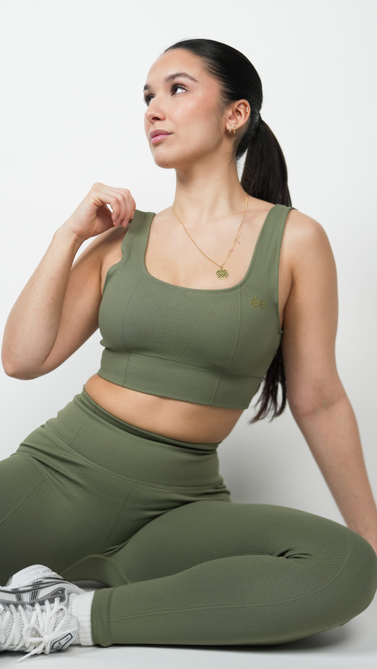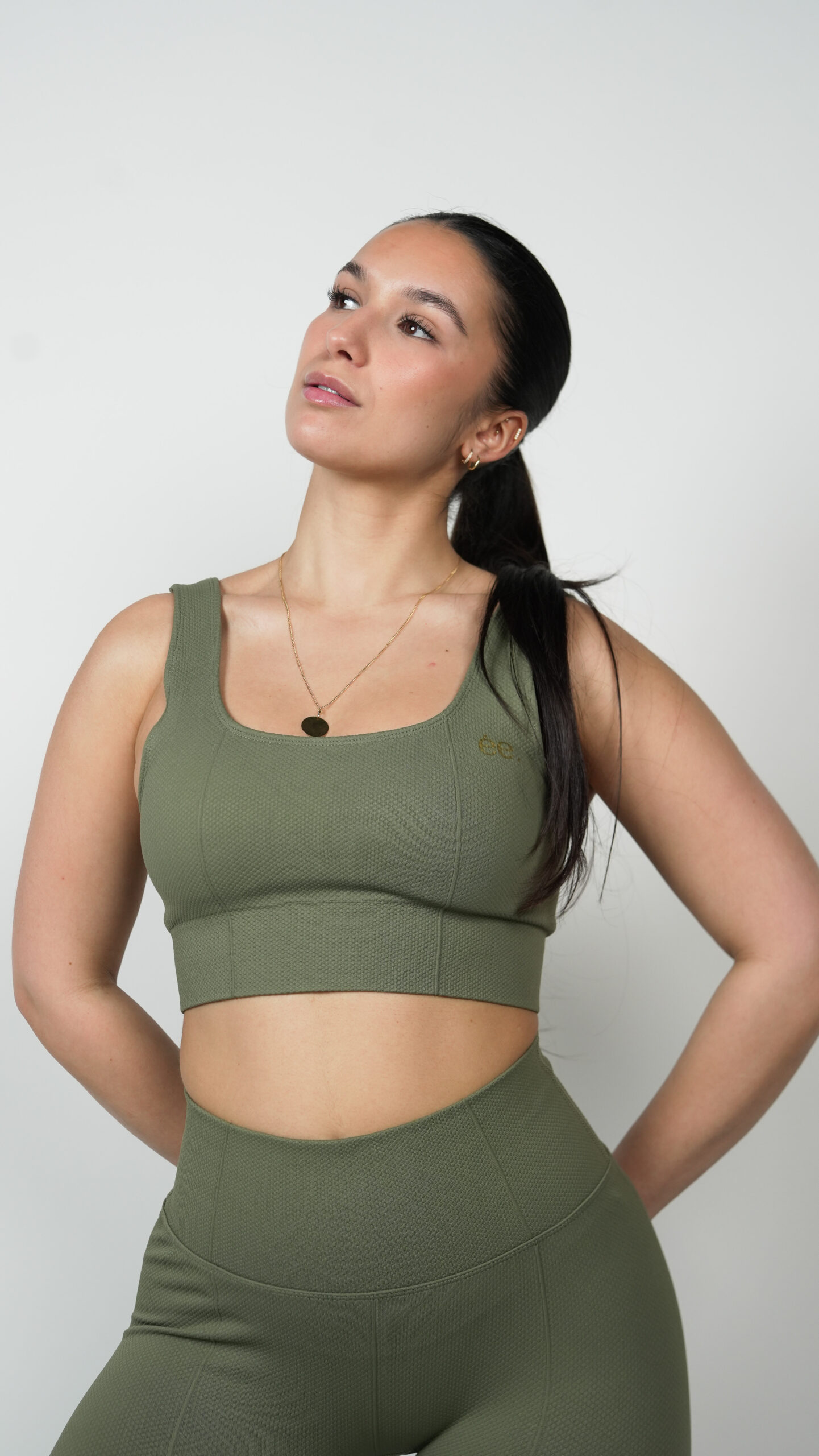 Le tissu de la Brassière Glow Club – Vert Olive Texture | ambrée. est conçu pour performer.