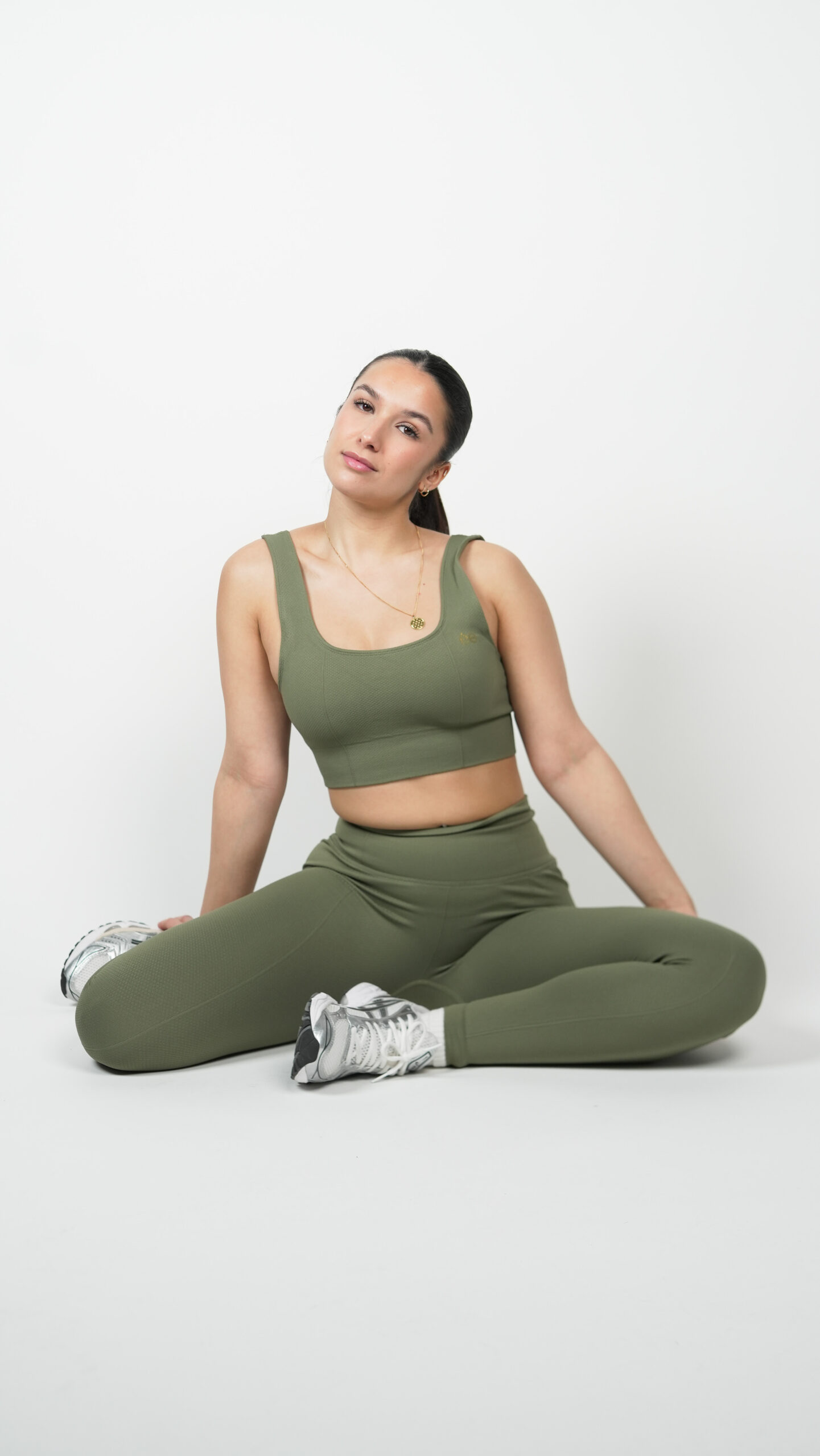 Associe-la avec le legging Glow Club Vert Olive Texture pour un ensemble complet, texturé et premium.