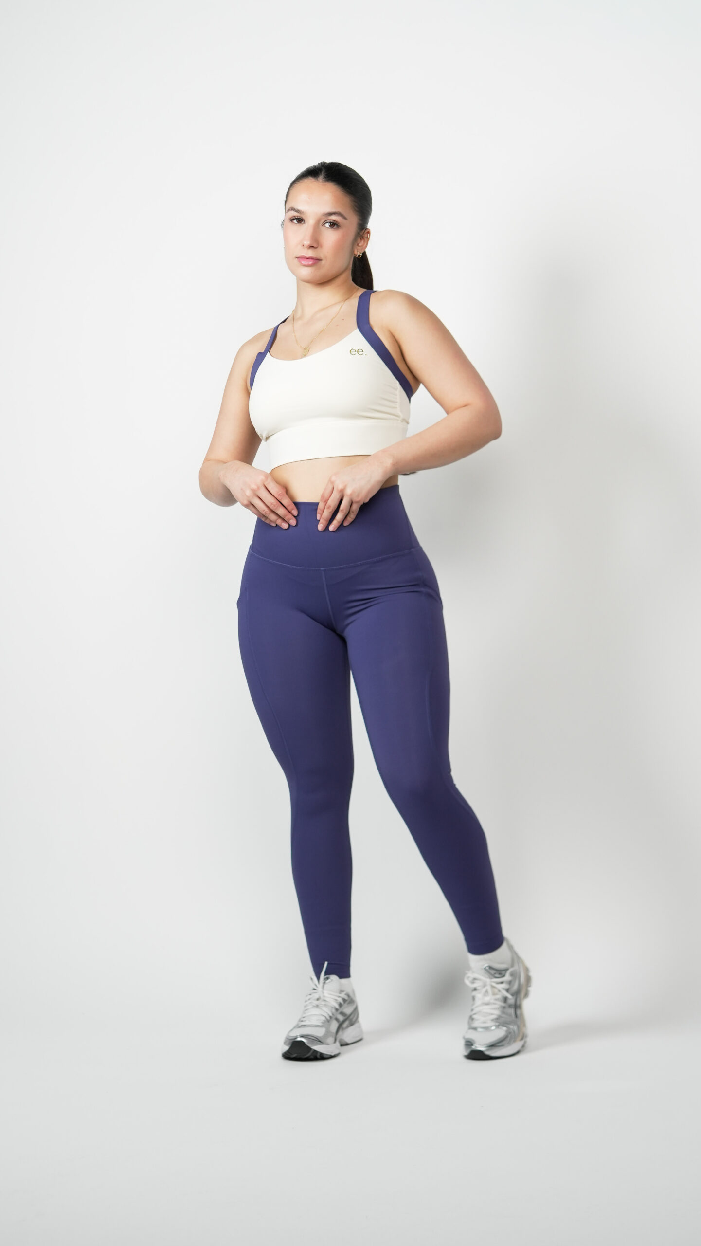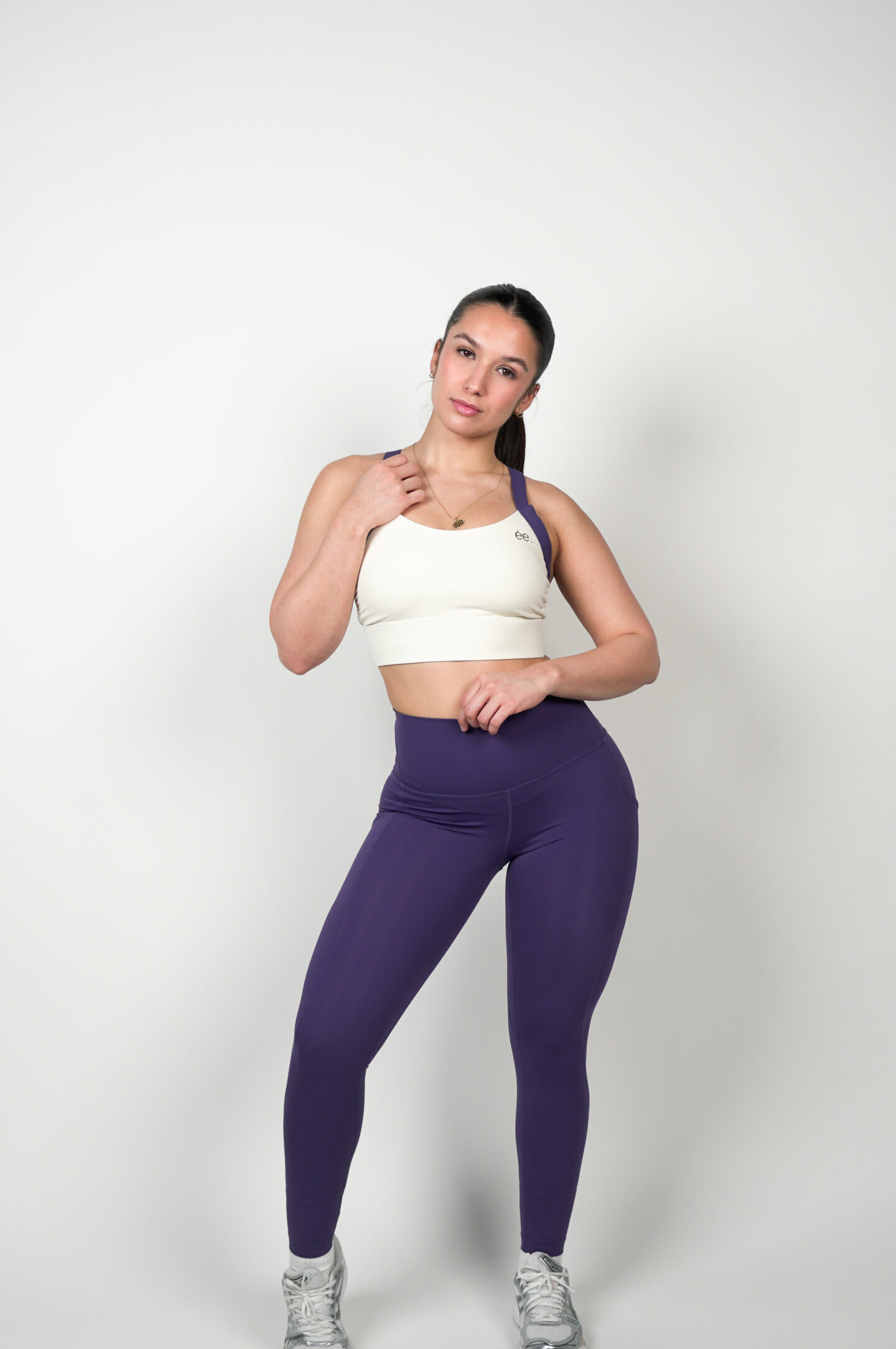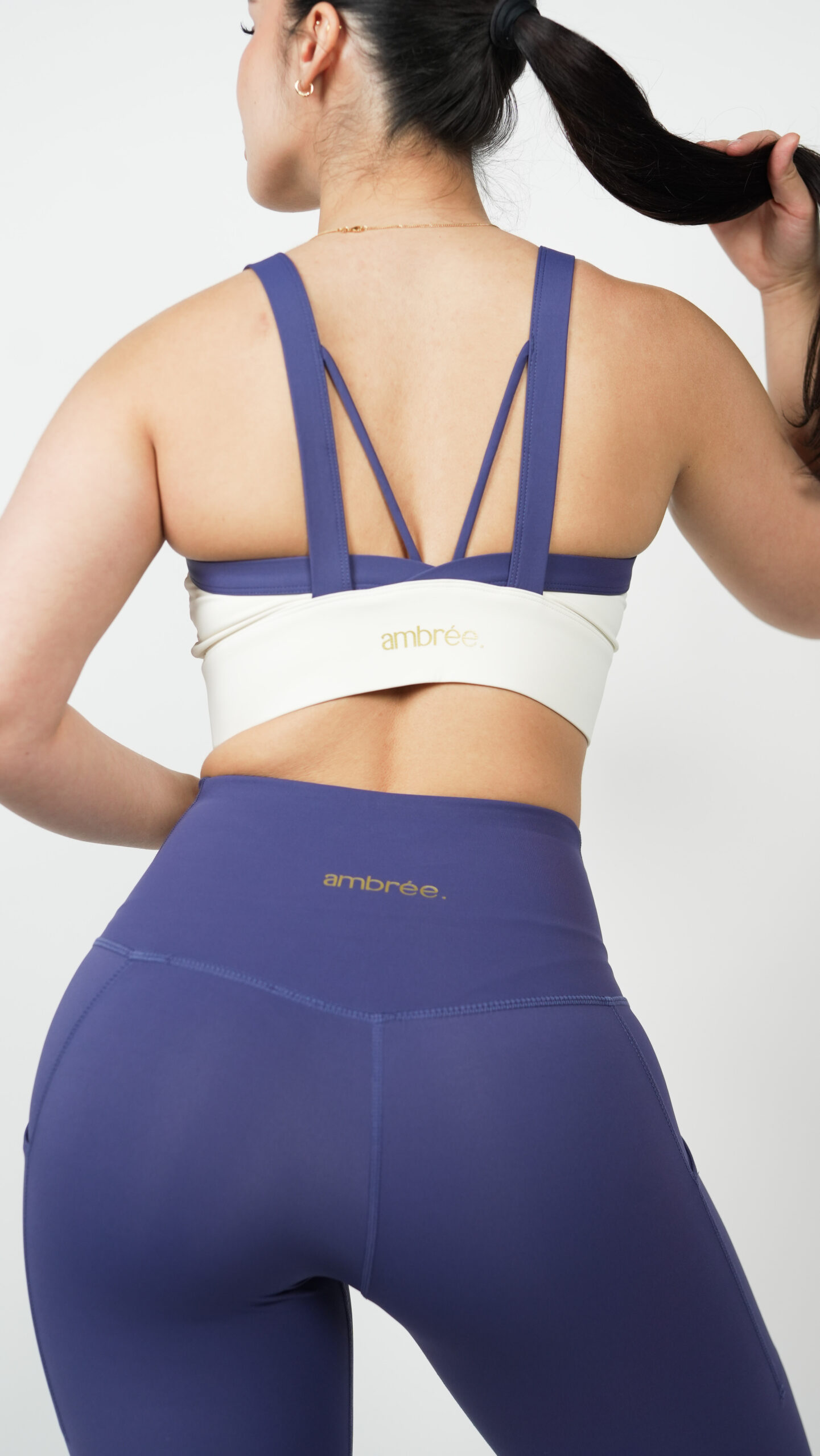 La Brassière Glow Club – Violet & Beige | ambrée. combine élégance et performance dans un design bi-color unique. L’association du violet profond et du beige doux crée un contraste subtil qui met en valeur la silhouette avec modernité.