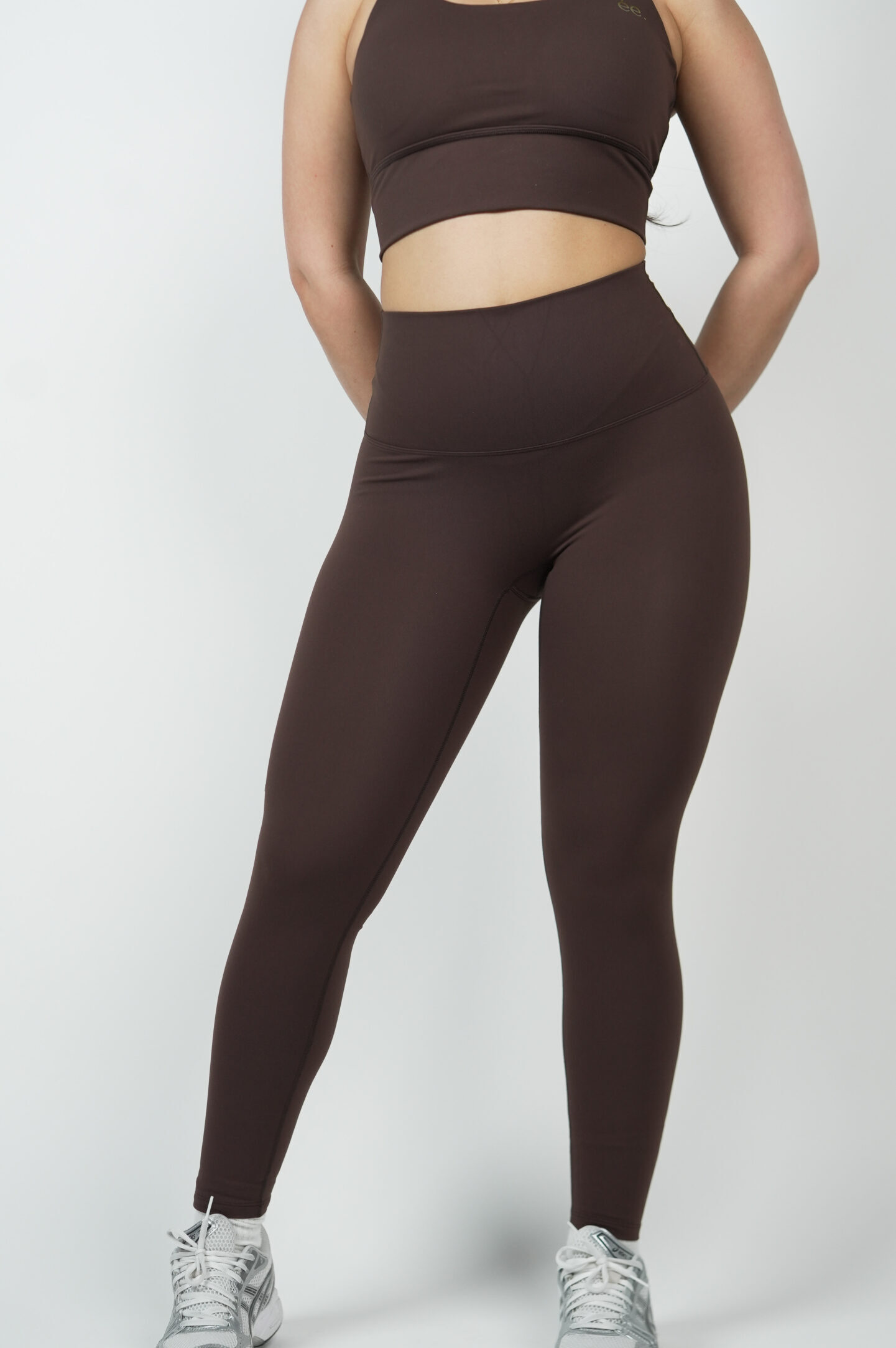 La taille haute gainante du Legging Glow Club – Marron Intense | ambrée. enveloppe la taille et les hanches pour un maintien stable pendant toute la journée.